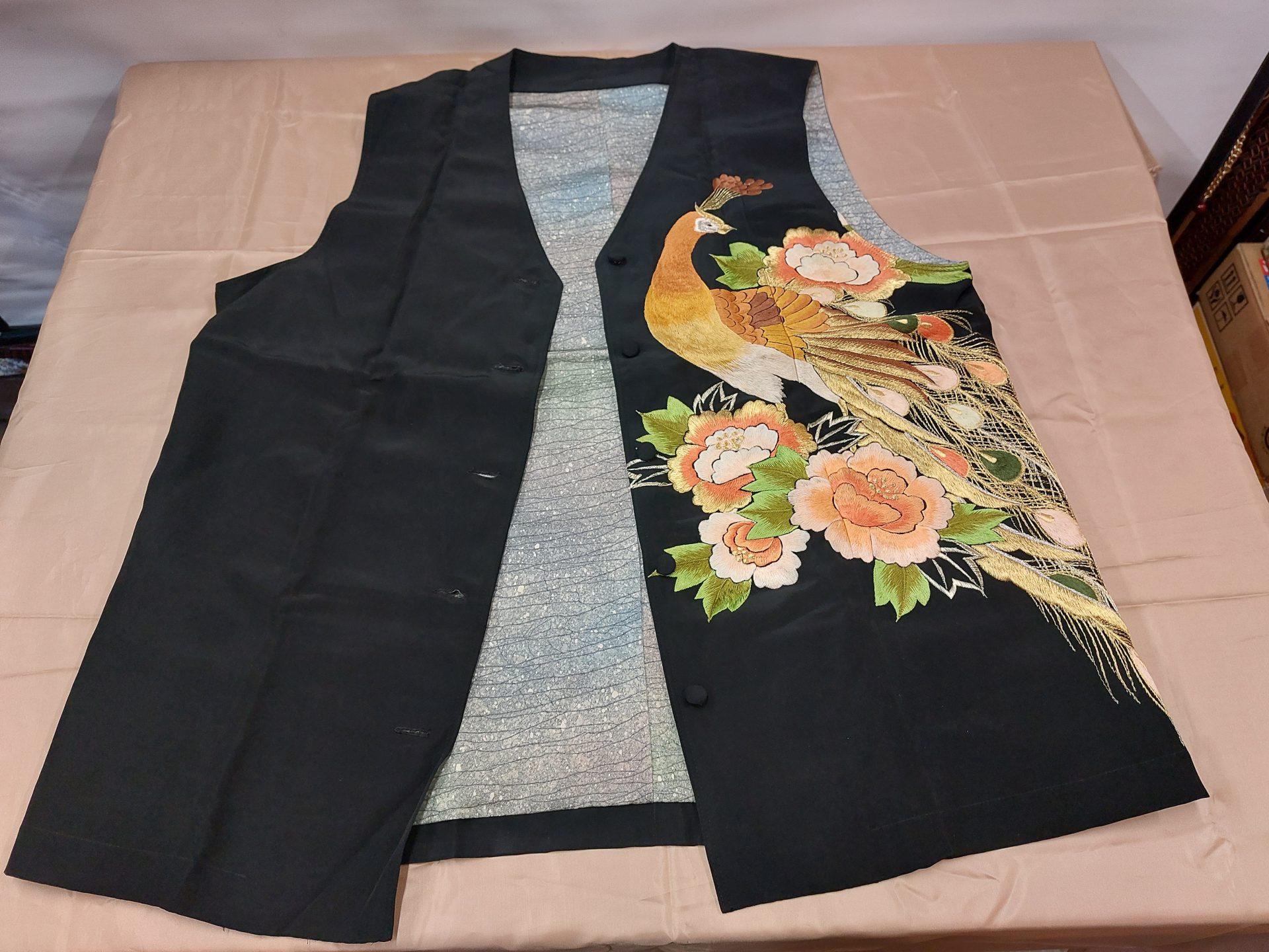 黒着物に孔雀、背中まで孔雀の羽があります。古い着物ですが刺繍を生かして見ました。 カテゴリー: 着物リメイク 工房八国山 長い年月を過ぎてリメイクのお仕事をさせていただいております。私達、工房八国山は古布を使用させていただき新しいデザインを考え、お客様に喜んでいただける商品を制作させていただきます。